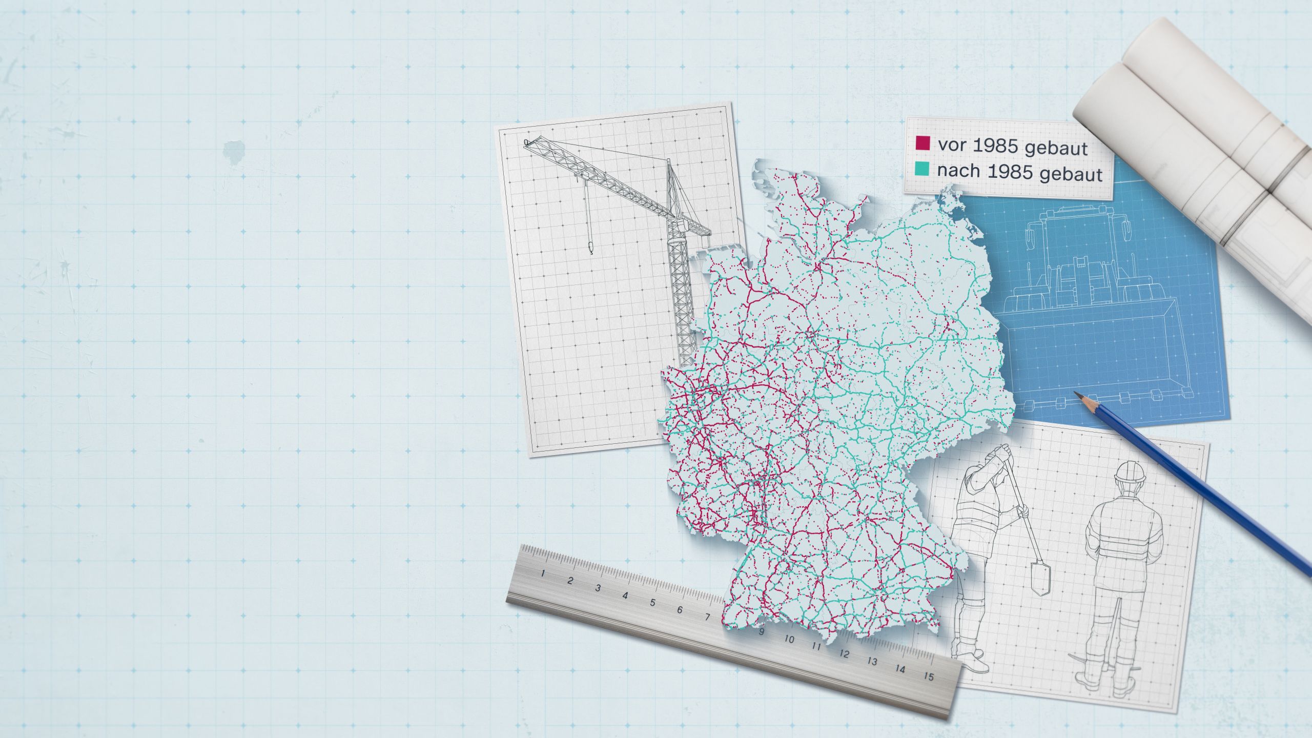 Rund 40.000 Brücken gibt es auf den Autobahnen und Bundesstraßen in Deutschland. Auf dieser Karte sieht es fast so aus wie das Straßennetz. Nur steht jeder Punkt (•) für eine Brücke oder einen Teil davon. Brücken auf zum Beispiel Landstraßen sind im Datensatz und in dieser Analyse nicht enthalten.