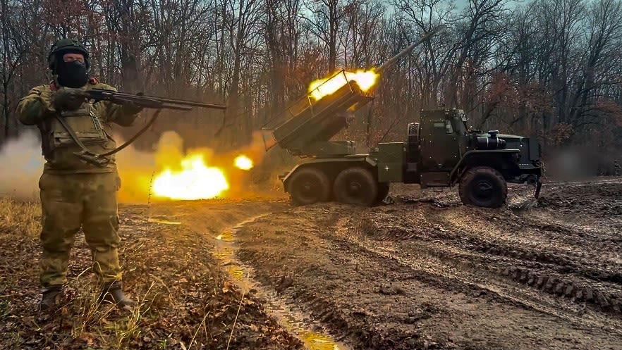 Ein russischer Mehrzweckraketenwerfer feuert auf ukrainische Stellungen. (Quelle: Russisches Verteidigungsministerium via AP/dpa)
